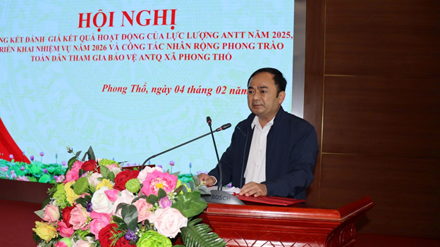 Đồng chí Chủ tịch UBND xã đề nghị trong năm 2026, Công an xã Phong Thổ tiếp tục phát huy vai trò nòng cốt, chủ trì phối hợp chặt chẽ với lực lượng tham gia bảo vệ ANTT ở cơ sở, trưởng thôn, bản, tổ dân phố trong công tác tuyên truyền, quán triệt và tổ chức thực hiện nghiêm các chủ trương của Đảng, chính sách, pháp luật của Nhà nước về công tác bảo đảm ANTT. Đồng thời, tăng cường công tác nắm tình hình, chủ động phòng ngừa, đấu tranh có hiệu quả với các loại tội phạm và hành vi vi phạm pháp luật ngay từ cơ sở.
