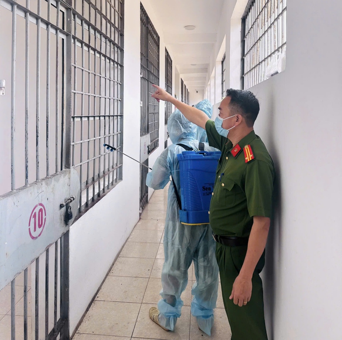 Một trong những hoạt động định kỳ và quan trọng nhất là công tác phun hóa chất khử khuẩn toàn bộ khuôn viên. Cán bộ y tế phối hợp cùng cán bộ quản giáo tiến hành phun thuốc sát trùng tại tất cả các khu vực: từ hành lang dẫn vào buồng giam, khu vực sinh hoạt chung đến các lối đi nội bộ.