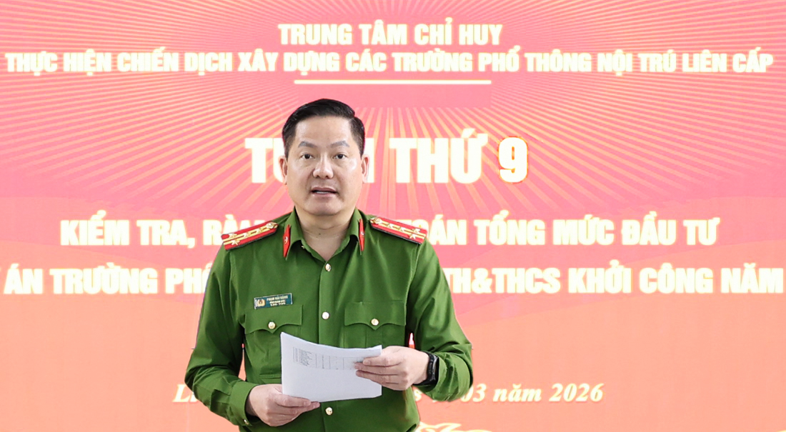Sáng 20/3/2026, tại Trung tâm chỉ huy thực hiện chiến dịch xây dựng các trường phổ thông nội trú liên cấp tỉnh Lai Châu, Hội nghị giao ban tiến độ Tuần thứ 9 đã được tổ chức dưới hình thức trực tiếp kết hợp trực tuyến. Đại tá Phạm Hải Đăng - Phó Giám đốc Công an tỉnh (đại diện đơn vị Chủ đầu tư) chủ trì Hội nghị.