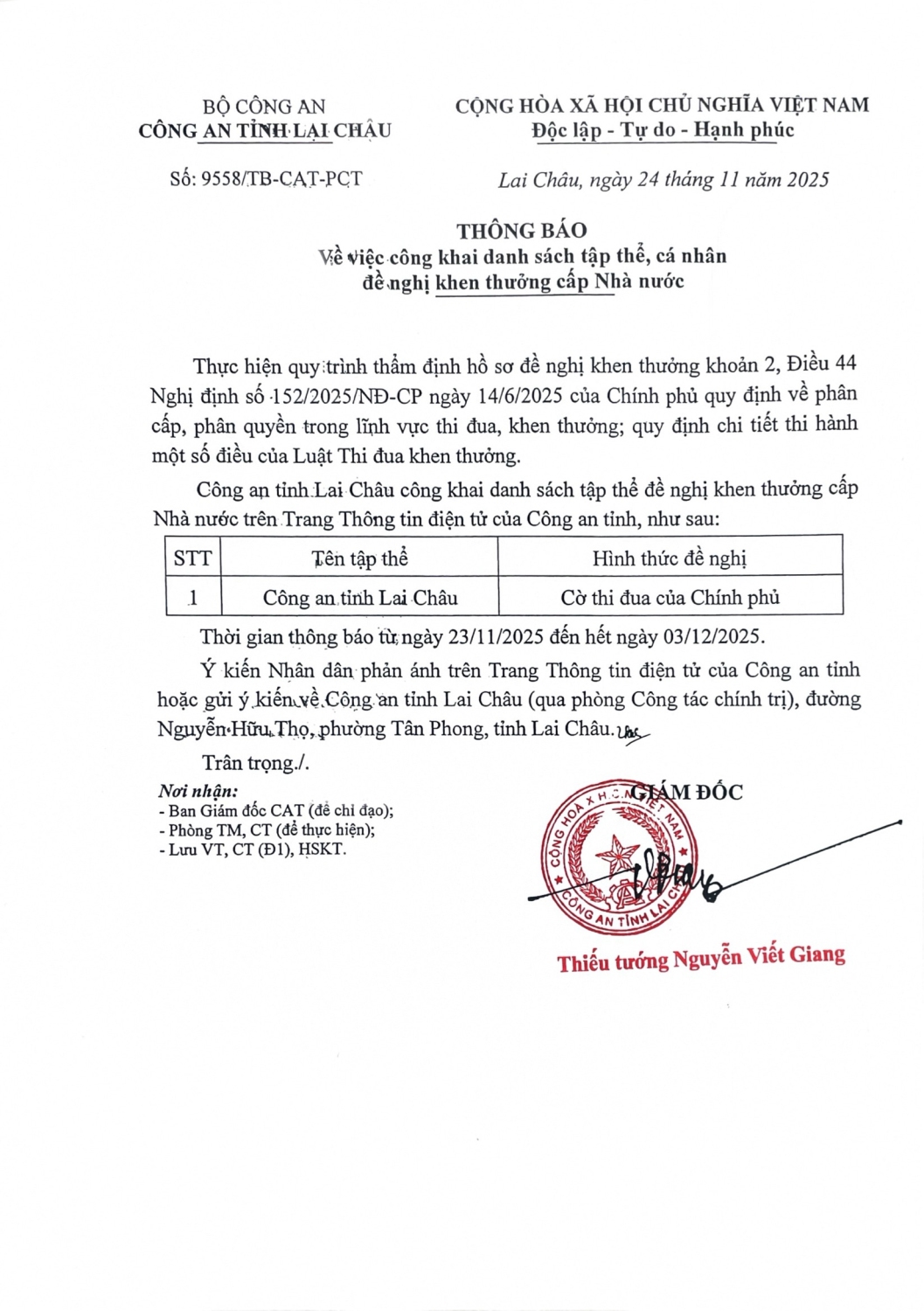 Thực hiện quy trình trình thẩm định hồ sơ đề nghị khen thưởng theo khoản 2, Điều 44 Luật Thi đua, Khen thưởng và Điều 44 Nghị định 152/2025/NĐ-CP ngày 14/6/2025 của Chính phủ về phân cấp, phân quyền trong lĩnh vực thi đua, khen thưởng, Công an tỉnh Lai Châu tổ chức công khai danh sách tập thể đề nghị khen thưởng cấp Nhà nước trên Trang Thông tin điện tử của Công an tỉnh, cụ thể như sau:
