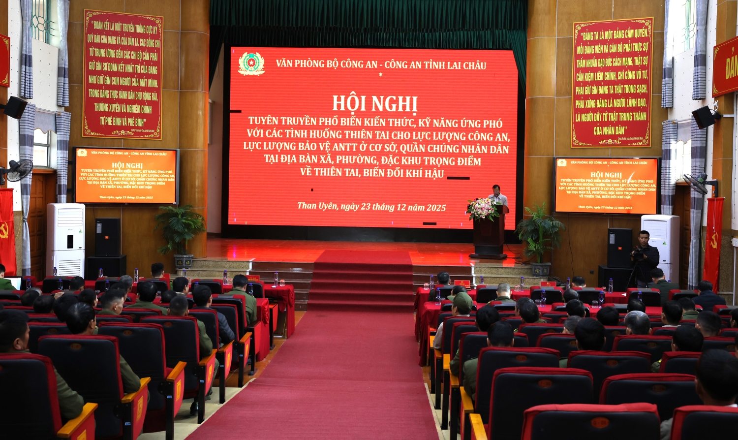 Tại hội nghị, đại diện Phòng Tham mưu Công an tỉnh Lai Châu đã thông tin khái quát về tình hình thiên tai, biến đổi khí hậu trên địa bàn tỉnh thời gian qua; đồng thời trình chiếu các video tuyên truyền, hướng dẫn kiến thức, kỹ năng ứng phó với các tình huống thiên tai thường gặp.