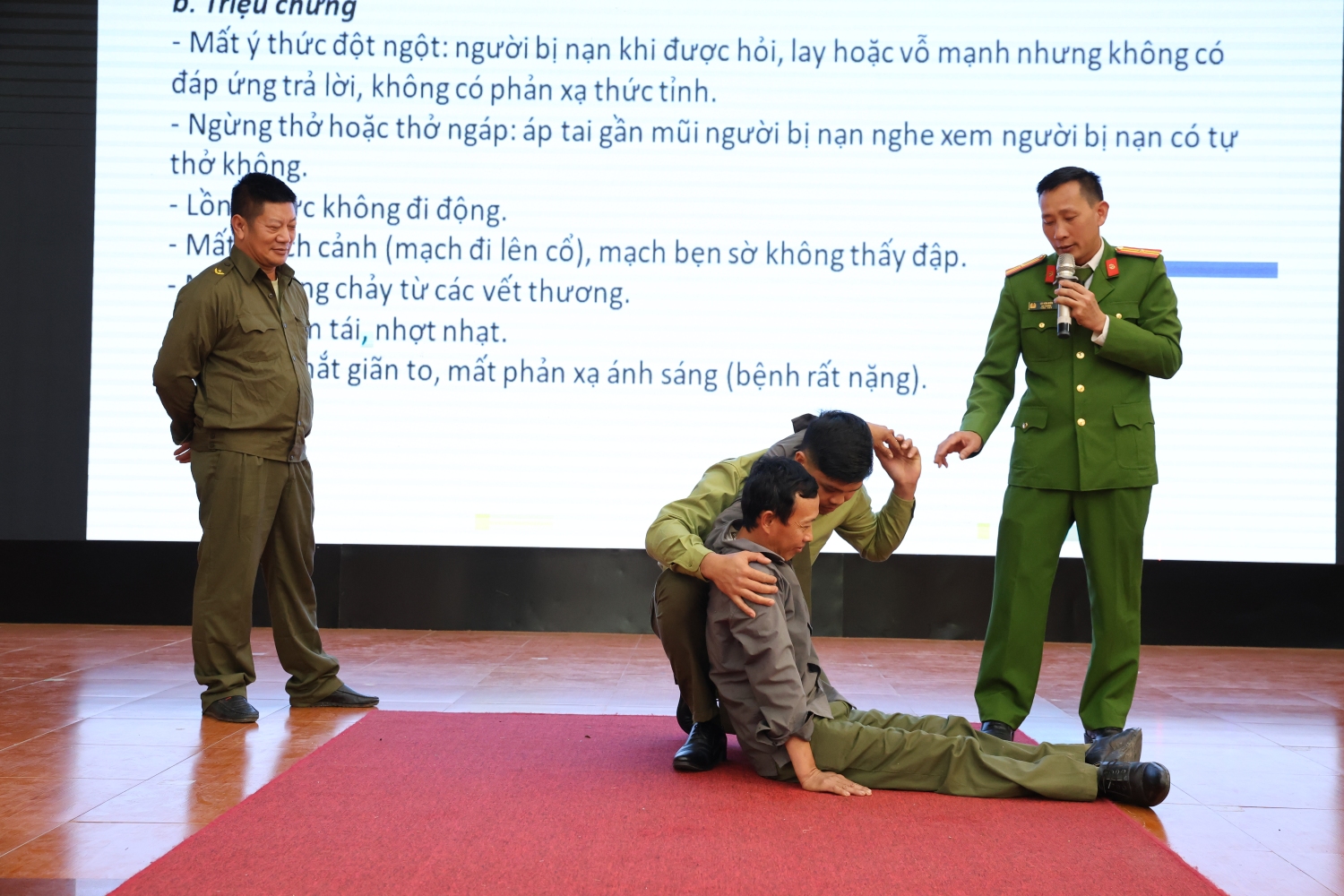Tiếp đó, cán bộ Phòng Cảnh sát Phòng cháy, chữa cháy và cứu nạn, cứu hộ Công an tỉnh đã phổ biến những kiến thức, kỹ năng cơ bản trong công tác cứu hộ, cứu nạn; hướng dẫn sơ cấp cứu ban đầu và phương pháp thoát nạn an toàn trong các tình huống khẩn cấp.