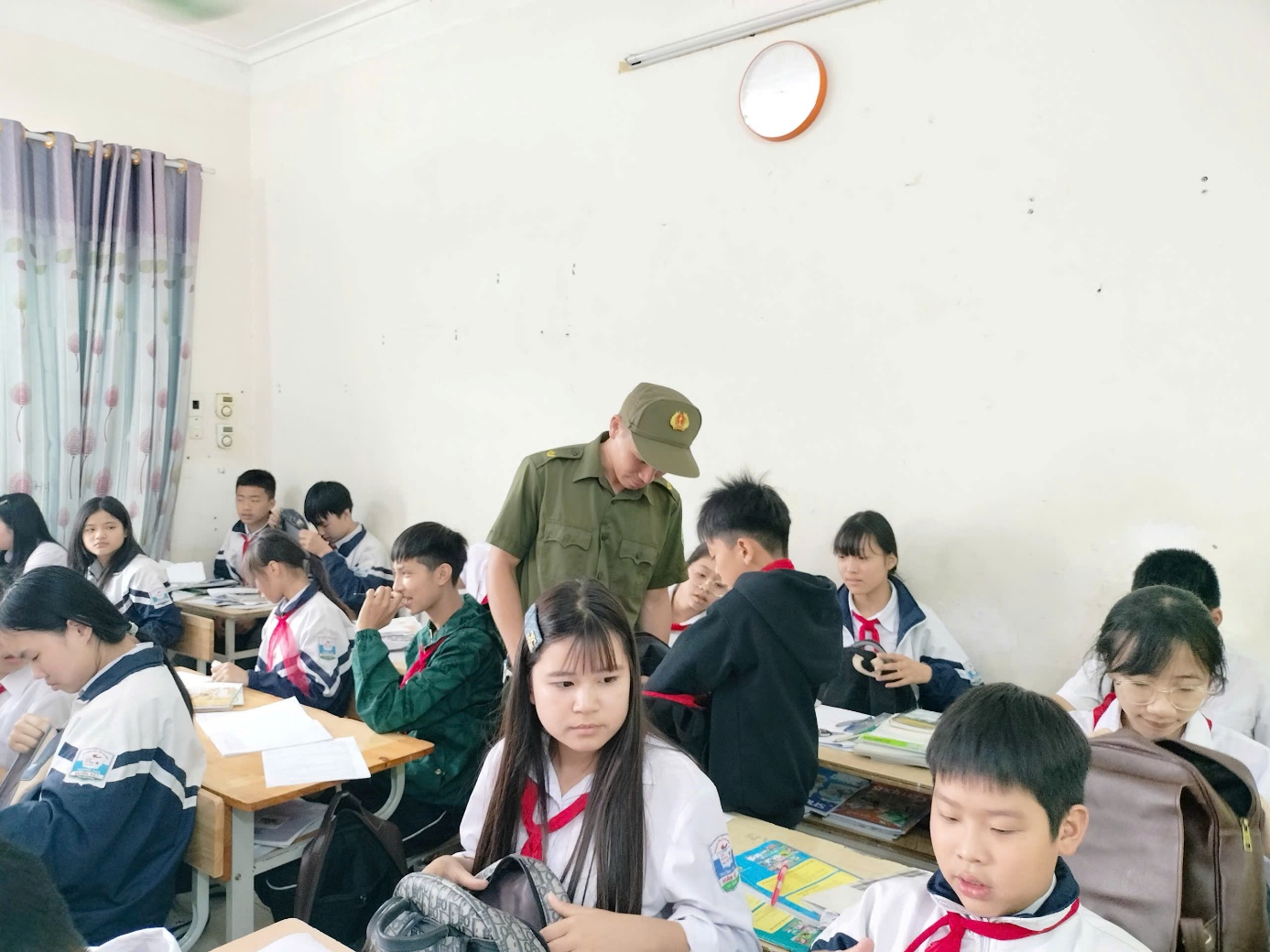 Bên cạnh đó, Công an phường Đoàn Kết cũng phối hợp với nhà trường tổ chức kiểm tra việc học sinh mang theo các vật dụng như vũ khí, hung khí, thuốc lá, thuốc lá điện tử vào khuôn viên trường học. Qua kiểm tra, học sinh đều thực hiện tốt quy định, không phát hiện trường hợp vi phạm, thể hiện tinh thần tự giác và ý thức trách nhiệm cao của các em.