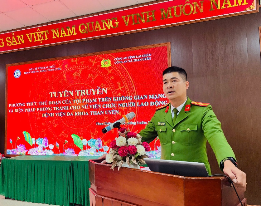 Thực hiện Kế hoạch số 12/KH-LĐLĐ ngày 27/02/2026 của Liên đoàn Lao động tỉnh Lai Châu về tổ chức các hoạt động kỷ niệm 116 năm Ngày Quốc tế Phụ nữ 8/3, 1986 năm Khởi nghĩa Hai Bà Trưng và Ngày Quốc tế Hạnh phúc 20/3, ngày 08/3/2026, Bệnh viện Đa khoa Than Uyên đã tổ chức chương trình giao lưu, tuyên truyền pháp luật với chuyên đề “Phòng chống lừa đảo online đối với phụ nữ trong thời kỳ chuyển đổi số”. Tham gia chương trình, Công an xã Than Uyên được mời làm báo cáo viên, trực tiếp tuyên truyền, phổ biến kiến thức pháp luật và kỹ năng phòng ngừa tội phạm trên không gian mạng cho nữ cán bộ, công chức, viên chức, người lao động của bệnh viện.