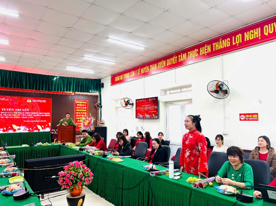 Trong phần trao đổi, thảo luận, nhiều tình huống thực tế gắn với đời sống sinh hoạt và quá trình sử dụng mạng xã hội của nữ cán bộ, nhân viên bệnh viện đã được đặt ra. Báo cáo viên của Công an xã Than Uyên đã trực tiếp giải đáp, phân tích cụ thể từng tình huống, giúp người tham dự hiểu rõ hơn cách nhận diện và xử lý khi gặp các dấu hiệu lừa đảo trên không gian mạng.
