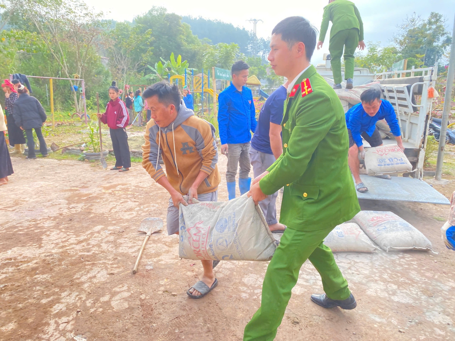 Trong khuôn khổ hoạt động, đoàn viên thanh niên Công an xã đã trực tiếp tham gia vận chuyển vật liệu, trộn bê tông, san gạt và đổ sân khu vui chơi trong khuôn viên nhà trường. Mặc dù thời tiết và điều kiện lao động còn nhiều khó khăn, nhưng với tinh thần trách nhiệm và nhiệt huyết của tuổi trẻ, các đoàn viên đã hoàn thành công việc theo đúng kế hoạch đề ra. Hoạt động có ý nghĩa thiết thực, góp phần cải thiện cơ sở vật chất, tạo không gian vui chơi an toàn, sạch sẽ cho các em học sinh mầm non, đồng thời thể hiện sự quan tâm, chung tay của lực lượng Công an xã đối với sự nghiệp giáo dục trên địa bàn.