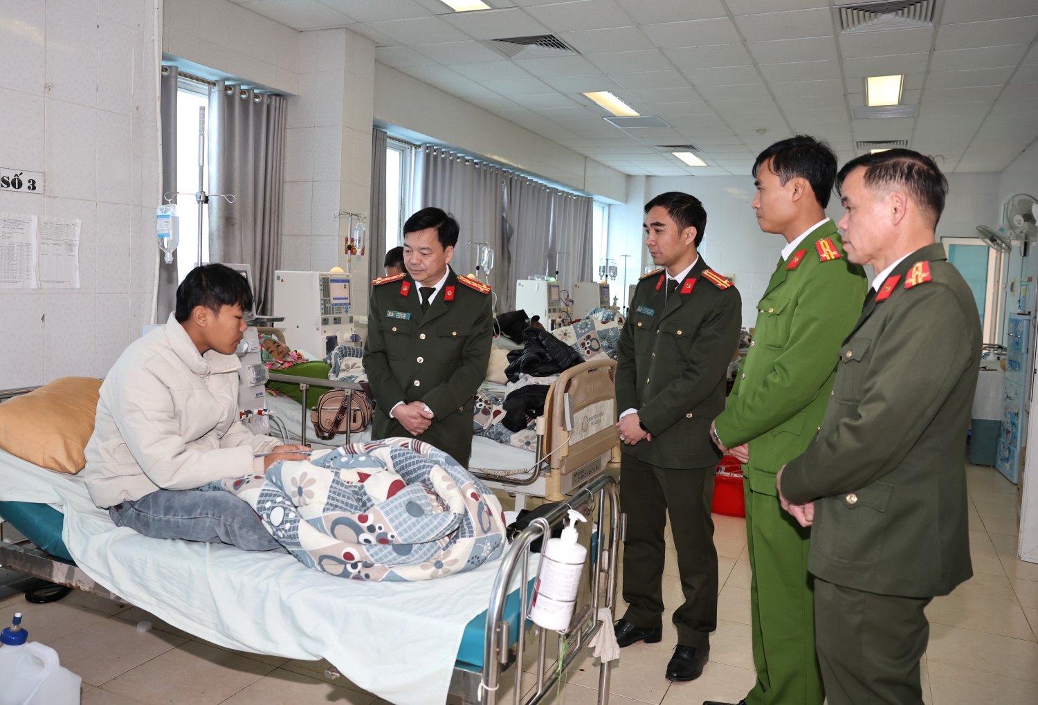 Theo đó, sáng nay 11/2, Đoàn công tác do Đại tá Sùng A Súa – Phó Giám đốc Công an tỉnh Lai Châu làm Trưởng đoàn đã trực tiếp đến thăm chiến sĩ thuộc Phòng Cảnh sát cơ động đang điều trị bệnh dài ngày tại Bệnh viên đa khoa tỉnh. Tại đây, đồng chí Phó Giám đốc cùng lãnh đạo các phòng chức năng đã ân cần thăm hỏi tình hình sức khỏe, quá trình điều trị, đồng thời động viên cán bộ, chiến sĩ và gia đình giữ vững tinh thần, yên tâm điều trị, nỗ lực vượt qua khó khăn để sớm ổn định cuộc sống.