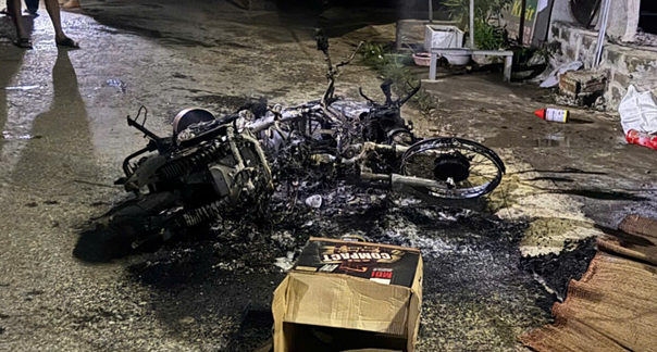 Chiếc xe máy và xe điện bị đối tượng đốt cháy tại hiện trường.