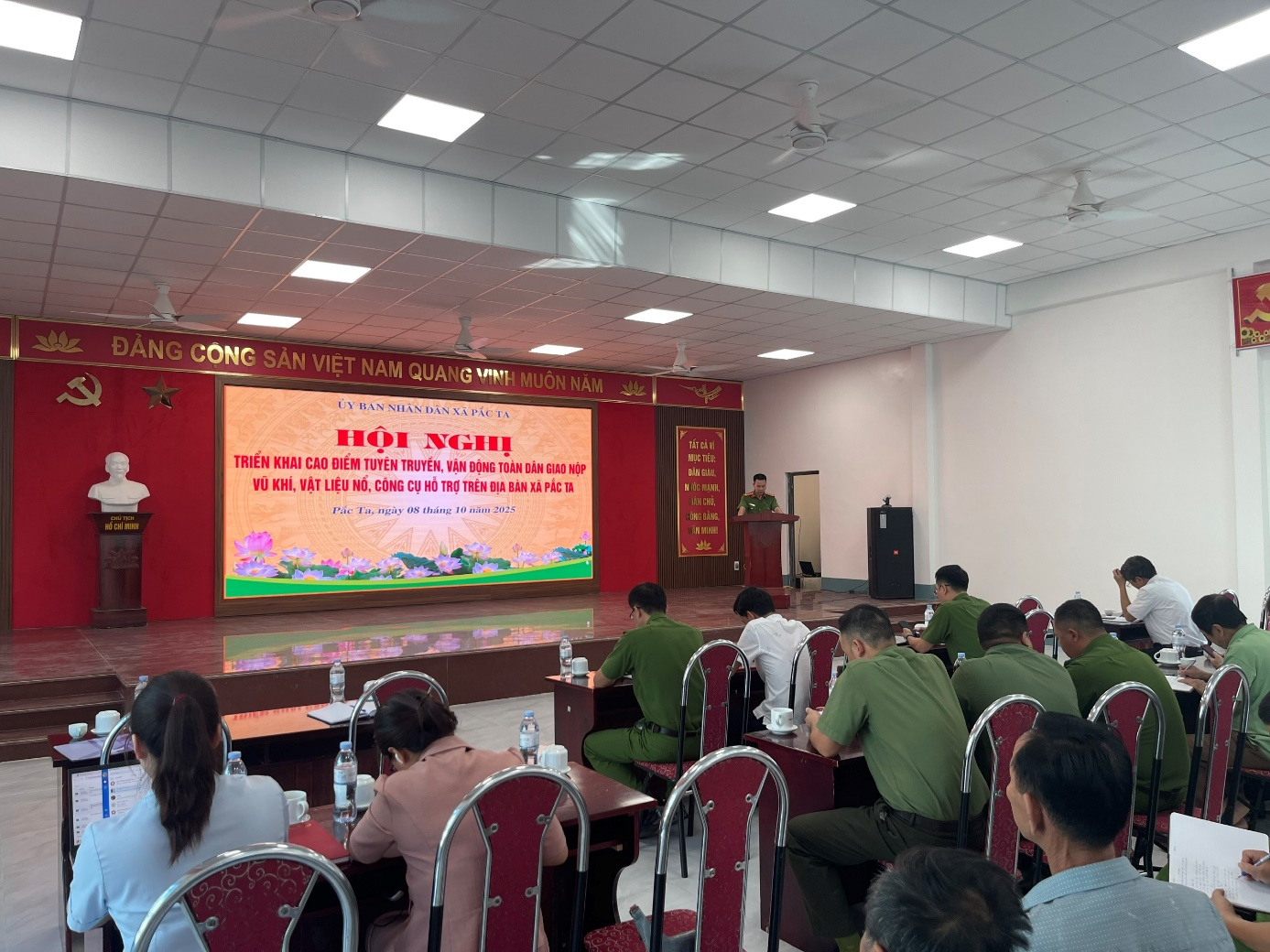 Ngày 08/10/2025, Công an xã Tham mưu UBND xã Pắc Ta, tổ chức Hội nghị triển khai cao điểm tuyên truyền, vận động toàn dân giao nộp vũ khí, vật liệu nổ, công cụ hỗ trợ trên địa bàn xã. Dự hội nghị có đồng chí Thượng tá Nguyễn Mạnh Tân - Phó Chánh văn phòng Cơ quan Cảnh sát điều tra Công an tỉnh Lai Châu, đồng chí Nguyễn Văn Sơn - Phó Chủ tịch UBND xã; CBCS Công an xã; lực lượng an ninh bảo vệ trật tự cơ sở xã, đại diện một số phòng, ban chuyên môn xã cùng toàn thể các đồng chí trưởng các bản trên địa bàn.