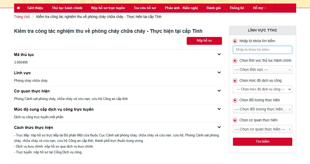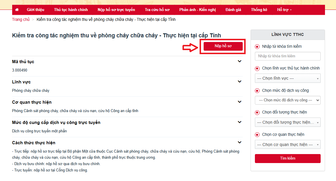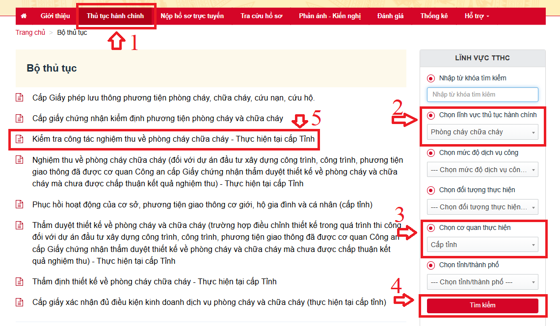 Bước 5:Chọn Thủ tục hành chính/chọn lĩnh vực Phòng cháy chữa cháy/chọn cơ quan thực hiện Cấp tỉnh/Click Tìm kiếm. Sau khi hiện kết quả tìm kiếm thì chọn Thẩm định thiết kế về phòng cháy chữa cháy - thực hiện tại cấp Tỉnh.