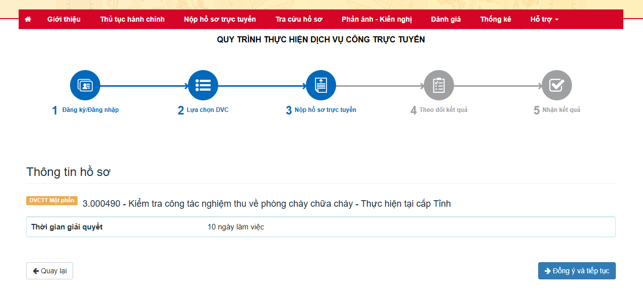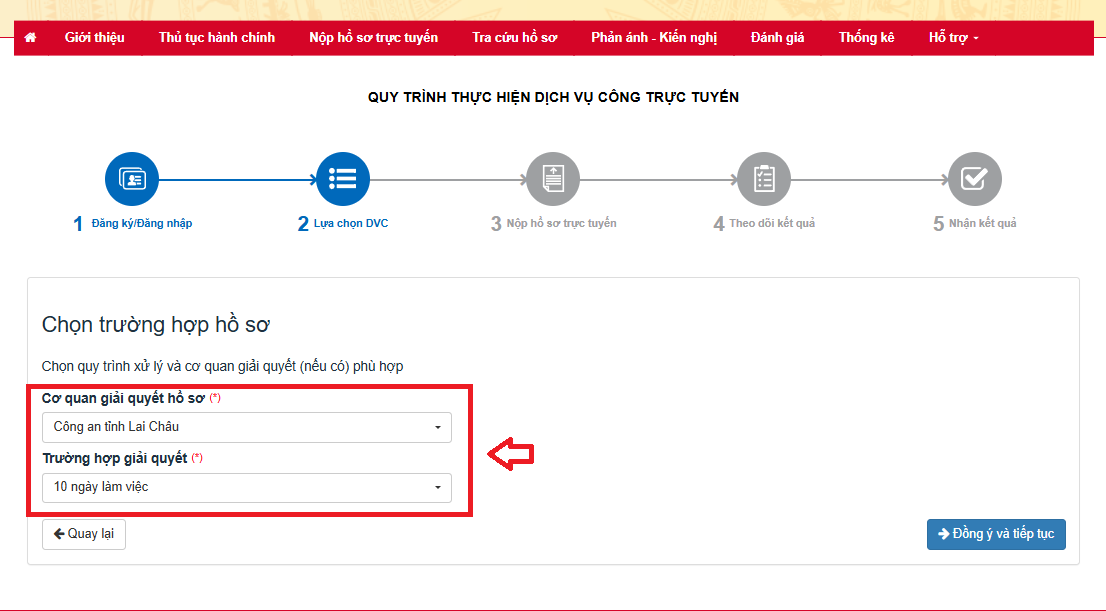 Bước 7: Chọn cơ quan giải quyết “Công an tỉnh Lai Châu”/Chọn Trường hợp giải quyết/Chọn Đồng ý và tiếp tục.