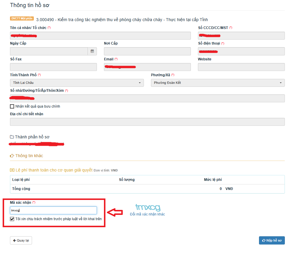 Bước 11: Kiểm tra lại các thông tin/Nhập mã xác thực/Tích chọn Tôi xin chịu trách nhiệm trước pháp luật về lời khai trên/Chọn Nộp hồ sơ.
