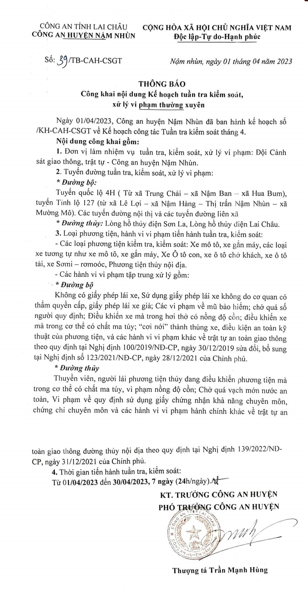 According to agency documents issued: Công an huyện Nậm Nhùn