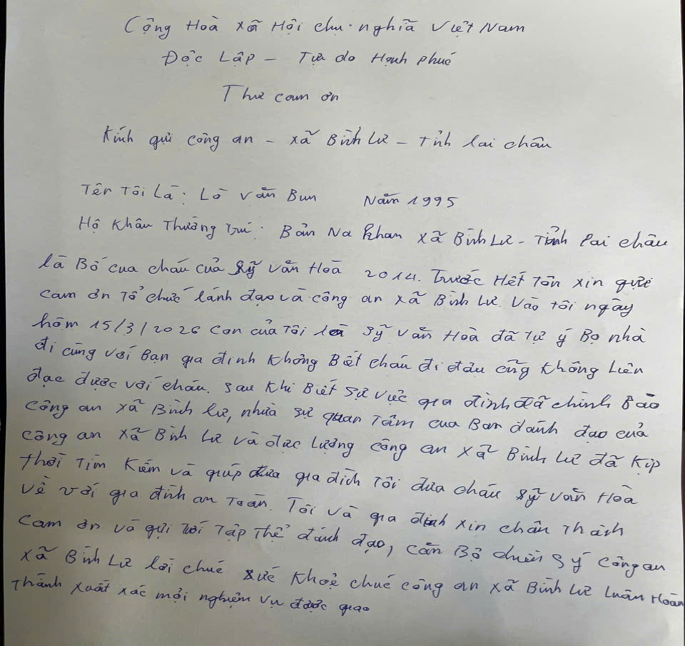 Xúc động trước sự tận tụy của các chiến sĩ Công an, anh Lò Văn Bun đã viết thư cảm ơn gửi đến Công an tỉnh Lai Châu và Công an xã Bình Lư.
