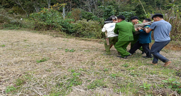 Công an xã Bản Bo cùng người dân đưa nạn nhân đi cấp cứu