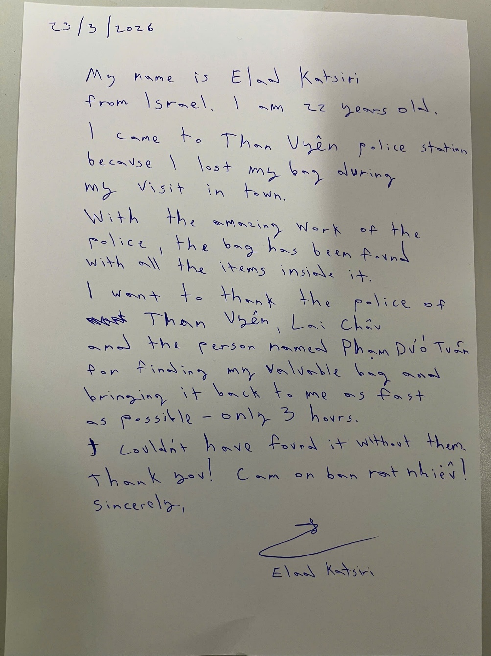 Xúc động trước tinh thần trách nhiệm và sự tận tâm của lực lượng Công an cũng như nghĩa cử cao đẹp của người dân địa phương, anh Elad Katsiri đã viết thư cảm ơn, bày tỏ sự trân trọng đối với Công an xã Than Uyên và cá nhân anh Phạm Đức Tuân. Đặc biệt, trong thư, anh đã viết bằng Tiếng Việt: “Cảm ơn bạn rất nhiều”, thể hiện tình cảm chân thành đối với lực lượng Công an và người dân Việt Nam.