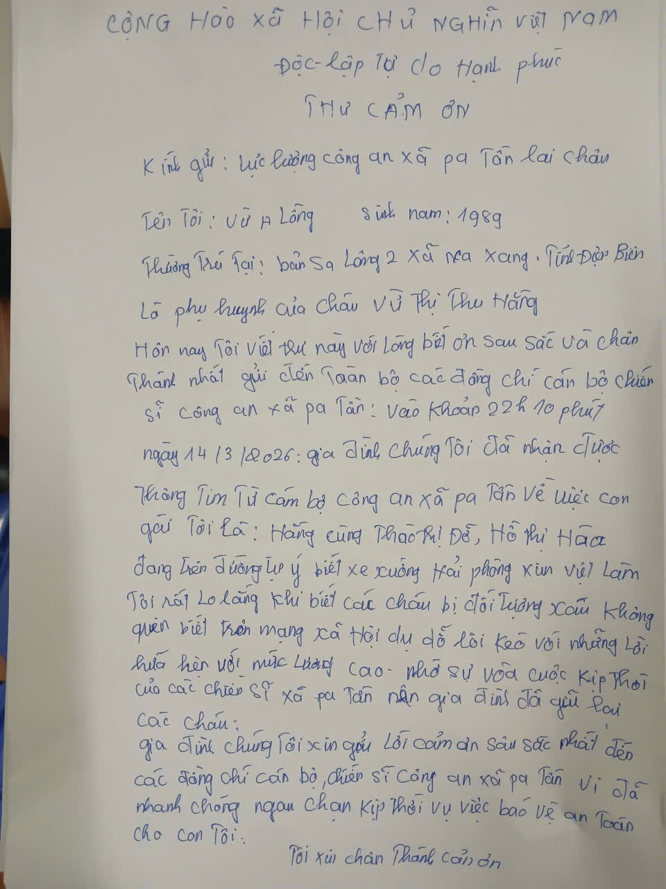 Nhận thấy dấu hiệu bất thường và việc hai cháu chưa đến tuổi lao động, các cán bộ Công an xã Pa Tần đã khuyên nhủ hai cháu, đưa hai cháu về trụ sở Công an xã và liên hệ với phụ huynh của hai cháu. Sau đó anh Hồ A Chinh, bố đẻ của cháu Hồ Thị Hòa và anh Vừ A Lồng, bố đẻ của cháu Vừ Thị Thu Hằng đã có mặt để đón hai cháu về nhà.