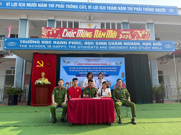 Sau phần tuyên truyền, nhà trường đã phối hợp với Công an phường tổ chức cho cán bộ, giáo viên và toàn thể học sinh ký cam kết thực hiện nghiêm các quy định của pháp luật, với các nội dung trọng tâm như: không tham gia bạo lực học đường; không sử dụng, tàng trữ thuốc lá điện tử và các chất kích thích; chấp hành nghiêm các quy định về an toàn giao thông; tích cực rèn luyện kỹ năng sống, xây dựng môi trường học đường an toàn, lành mạnh.