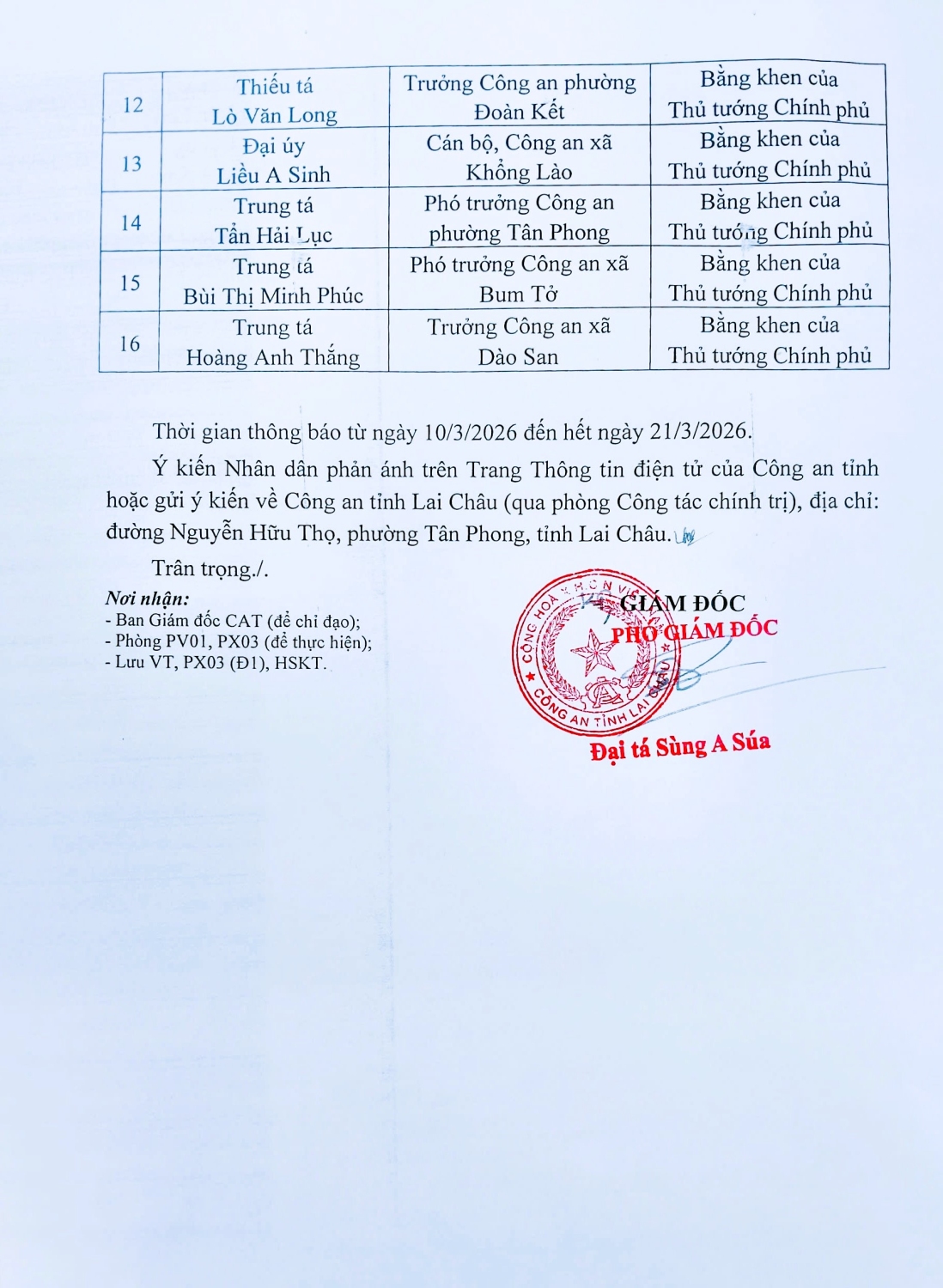 Công an tỉnh Lai Châu công khai danh sách tập thể, cá nhân đề nghị Bằng ken của Thủ tướng Chính phủ trên Trang Thông tin điện tử Công an tỉnh.