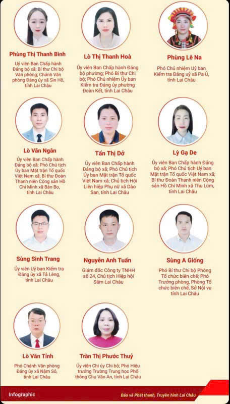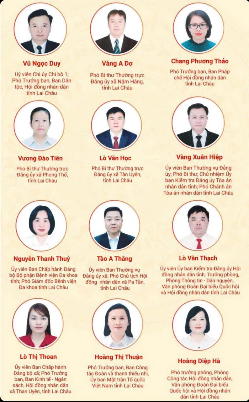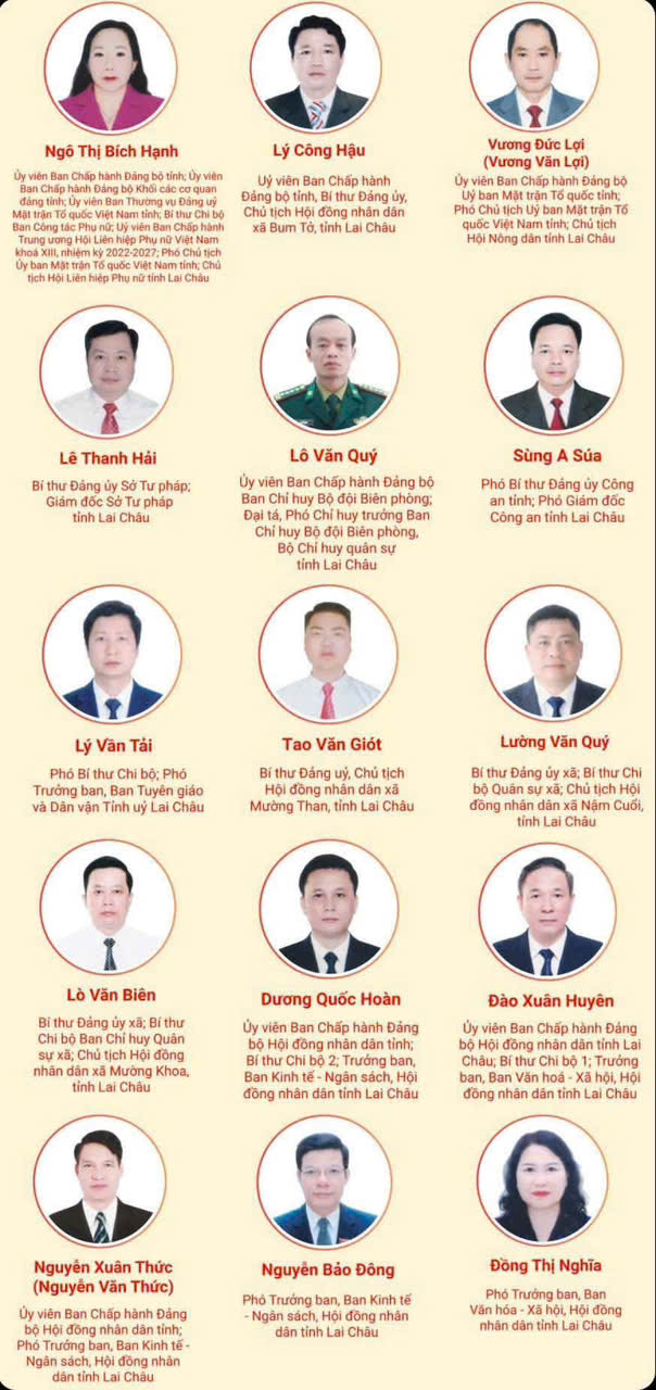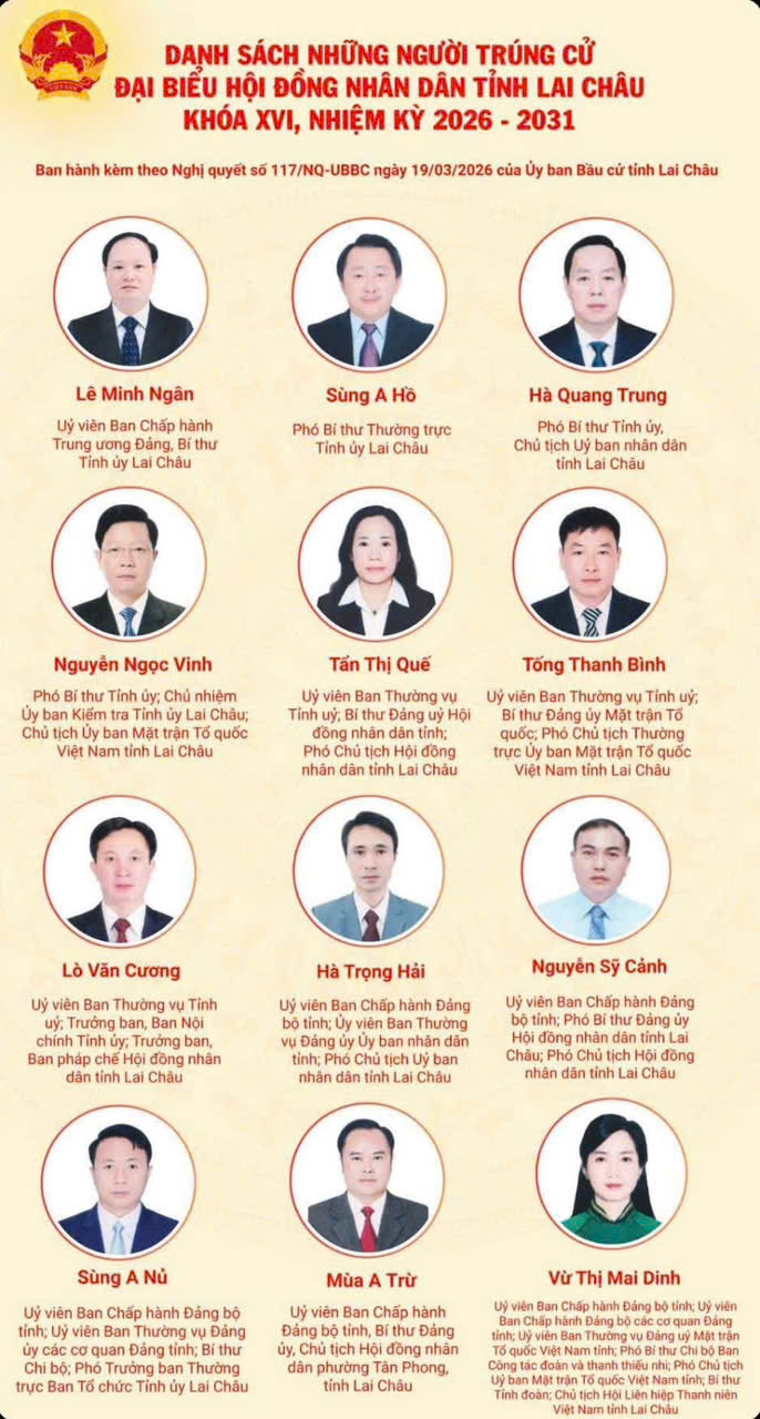 DANH SÁCH NHỮNG NGƯỜI TRÚNG CỬ ĐẠI BIỂU HỘI ĐỒNG NHÂN DÂN TỈNH LAI CHÂU KHOÁ XVI, NHIỆM KỲ 2026 - 2031 Chủ nhật - 22/03/2026 23:08 An ninh Lai Châu 16 . Từ khóa: nhân dân nhiệm kỳ danh sách hội đồng trúng cử Bài viết liên quan 1 Công bố kết quả bầu cử và danh sách những người trúng cử đại biểu HĐND tỉnh Lai Châu khóa XVI, nhiệm kỳ 2026 - 2031 19/03/2026 2 Thông tin tuyển sinh Công an nhân dân năm 2026 19/03/2026 3 Công khai danh sách tập thể, cá nhân đề nghị Bằng khen của Thủ tướng Chính phủ 17/03/2026 4 Cuộc bầu cử đại biểu Quốc hội khóa XVI và đại biểu Hội đồng nhân dân các cấp nhiệm kỳ 2026 – 2031 thành công tốt đẹp 16/03/2026 5 Công khai danh sách tập thể, cá nhân đề nghị khen thưởng cấp Nhà nước 02/03/2026